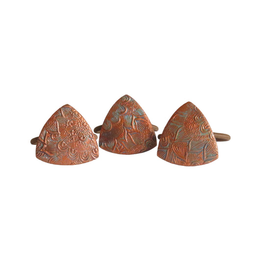 Coletero triangular con un acabado cobrizo y motivos en relieve de mandalas